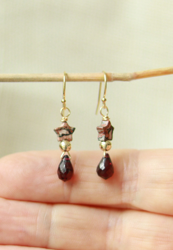 Artikelnummer: 43315 OverzichtDe oorbellen zijn gemaakt met facet geslepen granaat stenen en een stervorm jaspis.