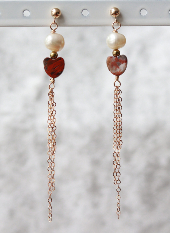 Zoetwaterparel, jaspis hart, 14k gold filled oorbellen