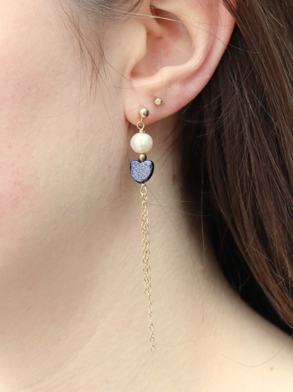 Artikelnummer: 43350 OverzichtDit paar oorbellen van zoetwaterparel in combinatie een diep middernachtblauwe hartvorm goudsteen, is een paar met een sterk contrast, maar subtiel genoeg voor elke dag! De oorbellen zijn handgemaakt en van hoge kwaliteit.