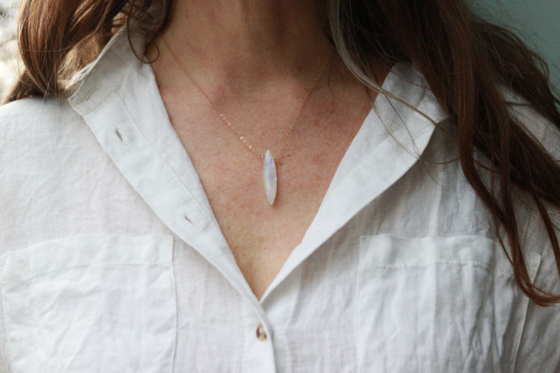 De hanger van deze ketting is gemaakt met een marquise facet geslepen regenboog maansteen. Er is gekozen voor een facet geslepen afwerking van de steen, de facet vangt het licht op en zorgt voor een glans die tot zijn recht komt bij elke beweging.