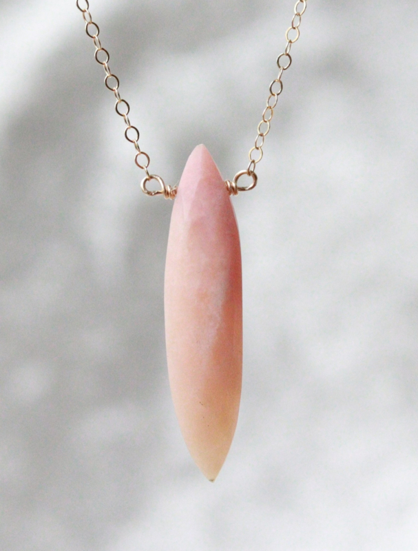 Roze opaal 14k gold filled of 925 zilveren kettingDe hanger van deze ketting is gemaakt met een roze marquise facet geslepen opaal steen. Er is gekozen voor een facet geslepen afwerking van de steen, de facet vangt het licht op en zorgt voor een glans die tot zijn recht komt bij…