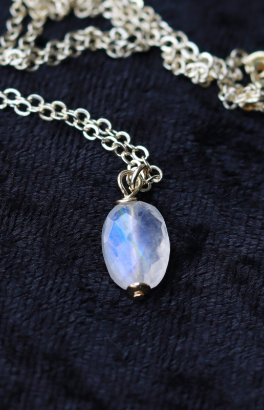 Regenboog maansteen ketting gold platedDe hanger van deze ketting is gemaakt met een facet geslepen regenboog maansteen, met blauwe of regenboog kleurige flitsen.